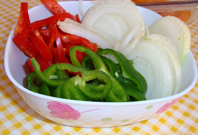 Os pimentões agora uso apenas o vermelho e o amarelo e dispensei o verde que solta muita água e tem sabor muito acentuado, cortados em tiras e as cebolas cortadas em meia lua finas.