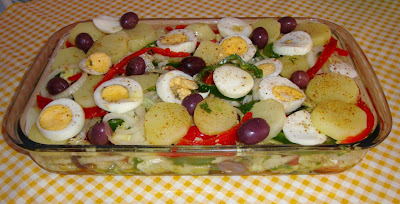 - Em seguida intercale nessa ordem; a cebola, as batatas, o bacalhau, os pimentões, os ovos, azeitonas e o cheiro-verde vão apenas na última camada.